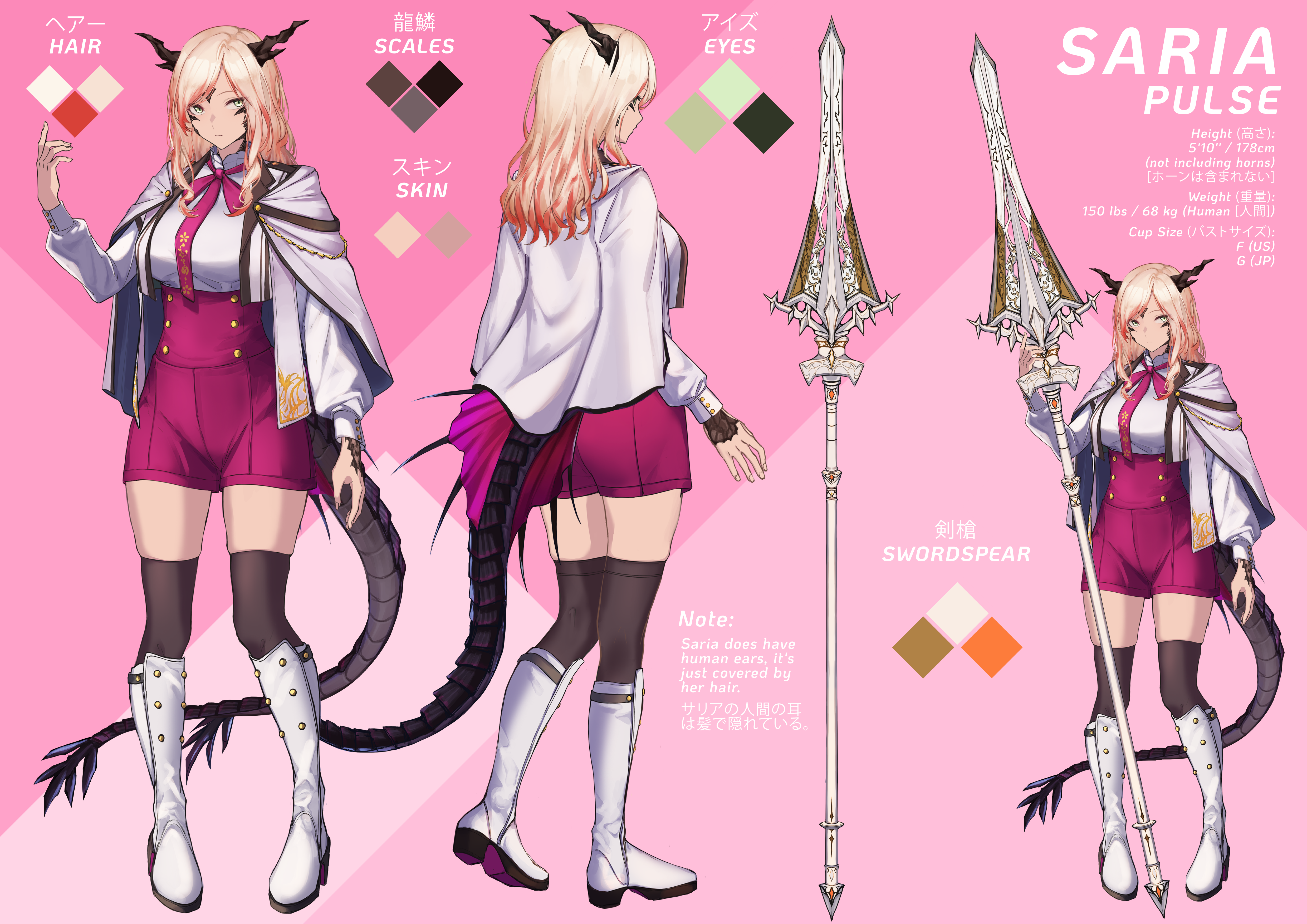 Saria, as a daughter to the dragons, has very noticeable draconic features, including her pitch-black scales covering small portions of her pale skin. In addition, black horns protrude from the top of her head, with a tail reaching the length of her legs. The tail has vibrant fins near the base. Despite this, however, she takes on a human-dominated appearance. Saria has long, flowing platinum blonde hair with natural red highlights, along with teal eyes.