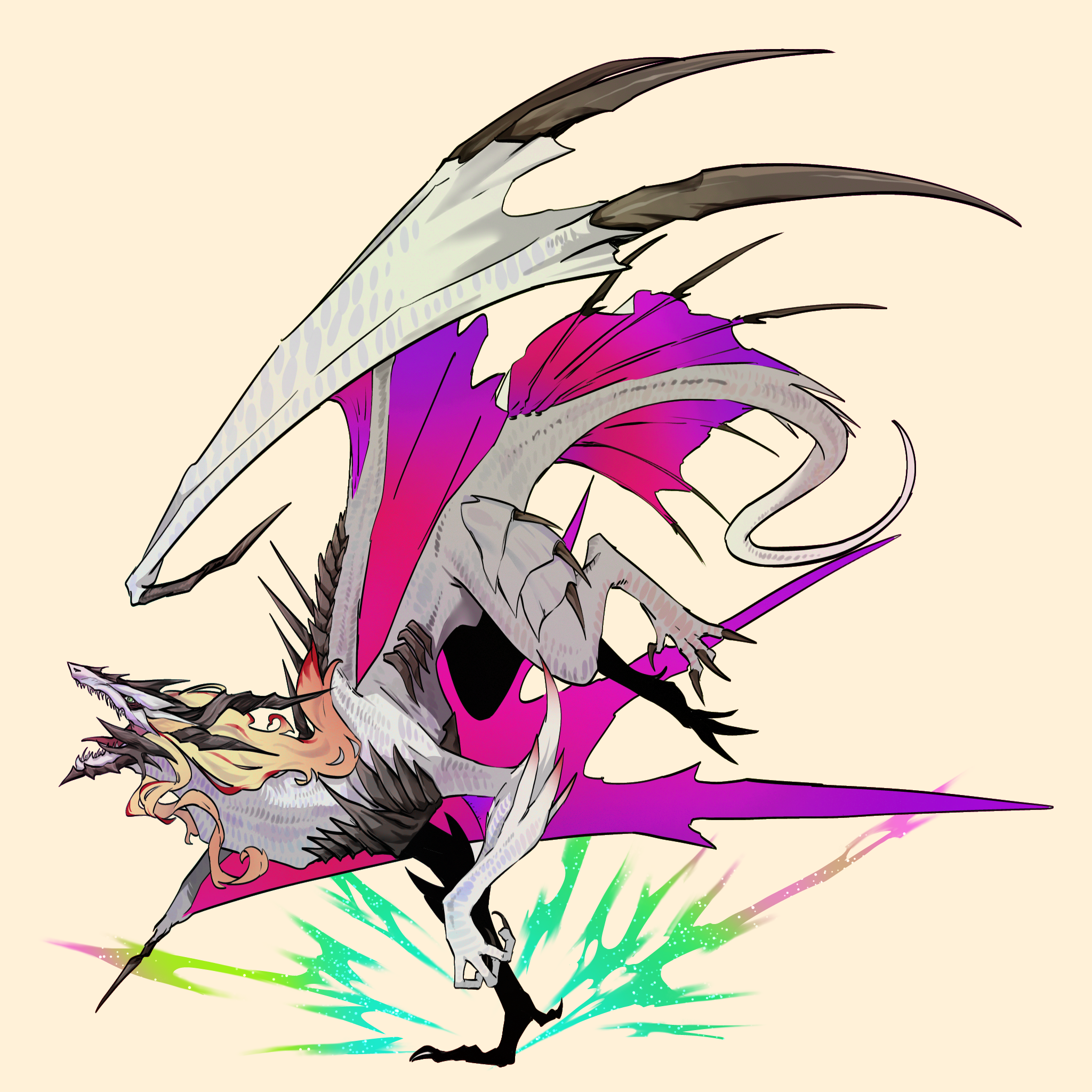 Saria also wields the primal instinct of the Expanse. By tapping into that power, she gains immense agility and strength. While half-breeds tend to struggle to transform into their more pure-primal counterparts, Saria uses the Concept’s power to not only easily grant her human form flight via ethereal wings, but also allow her to transform into her fully-fledged draconic form for an extended period of time.
